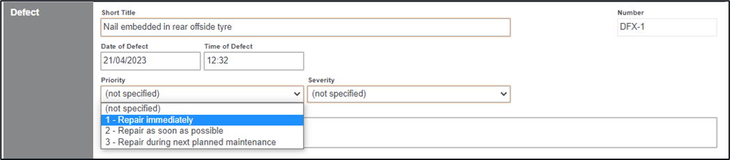 5. In the Defect section complete a title of the defect, and select a priority, and a severity of this defect to the business from the dropdowns available.
