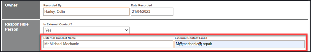 7. The Responsible Person section is the individual responsible for fixing this defect, there is a selectable option of this individual being an External Contact, in essence they don’t have access to your Centrik system, selecting this as YES will create areas for an External Contact Name and External Contact Email to be added. If the individual responsible is an internal contact, then typing in their name in the available field will allow you to select from the list.