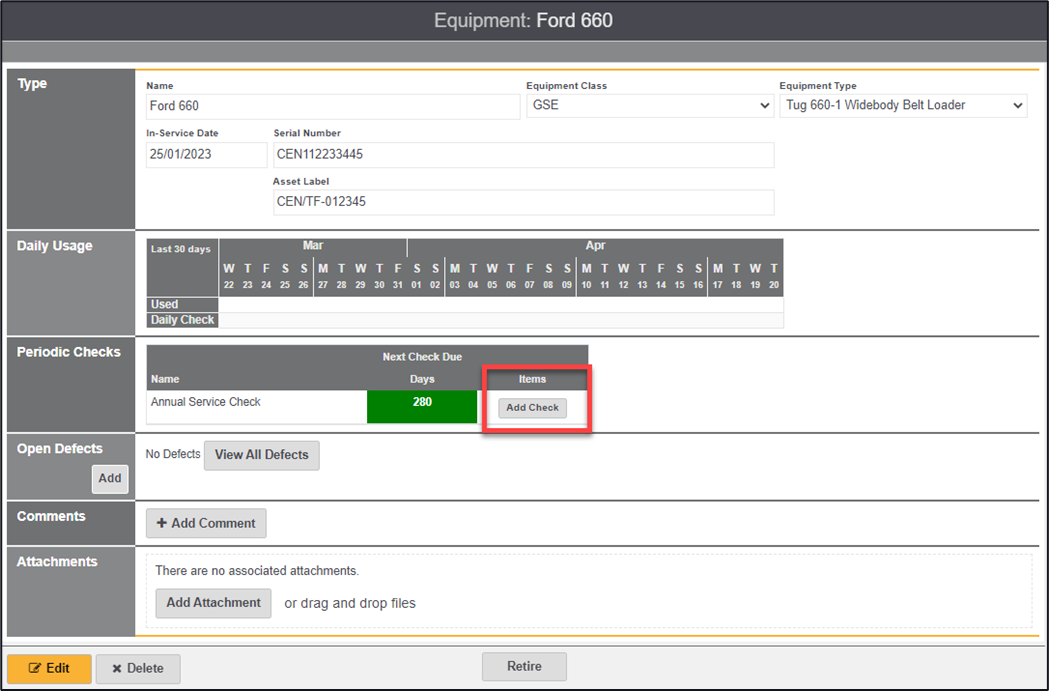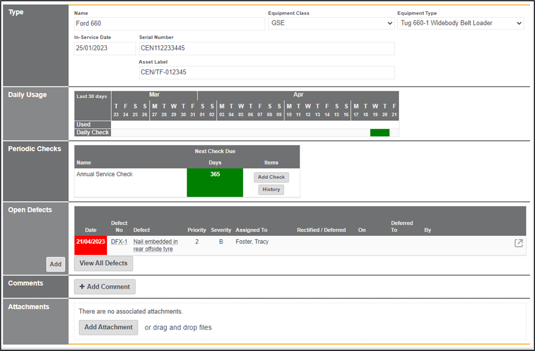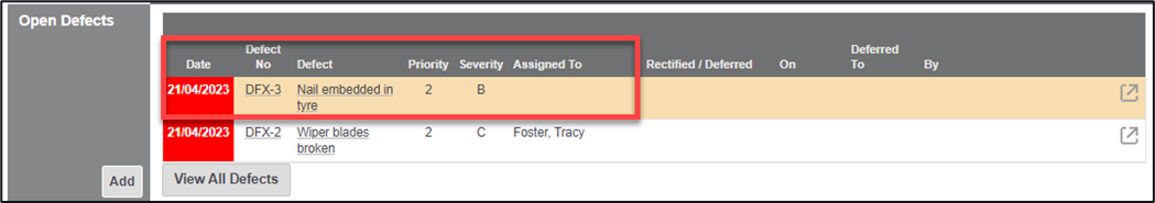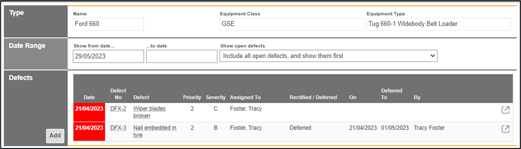 Navigating back to this specific piece of equipment will highlight any open defects, there is also the ability on this page to add a defect outside of a check