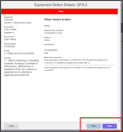 You are also able to search by selecting a defects pop-out box and scrolling through defects using the ‘Next’ and ‘Previous’ buttons if required.