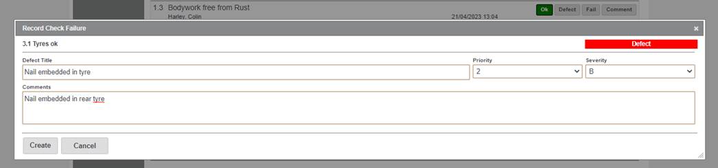3. Carry out the list of checks, selecting from the dropdowns available. If an item fails the checklist due to a defect, select this from the available list and add a comment if necessary
