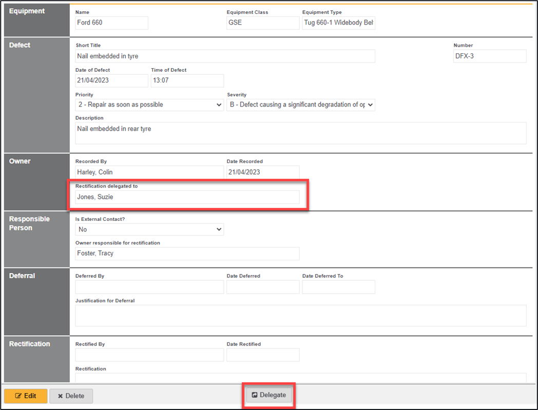 The individual can delegate the rectification of a defect by using the ‘Delegate’ button, the named individual is still the responsible owner, but they are able to list another individual as a delegated party.