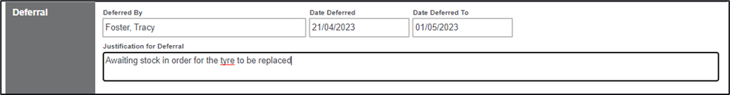 2. In the available Deferral box, enter in the details of who is deferring this defect, the date of deferral, the date that it is deferred to, and the justification for the deferral
