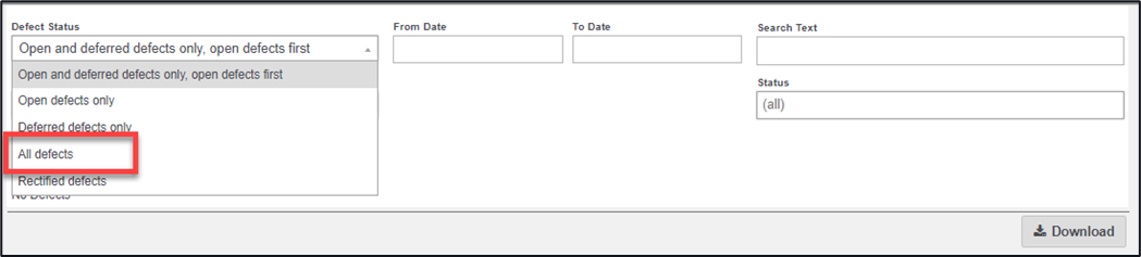 Clicking on ‘Search’ button after selecting an option from the dropdown displays all defects, open, deferred, and closed.