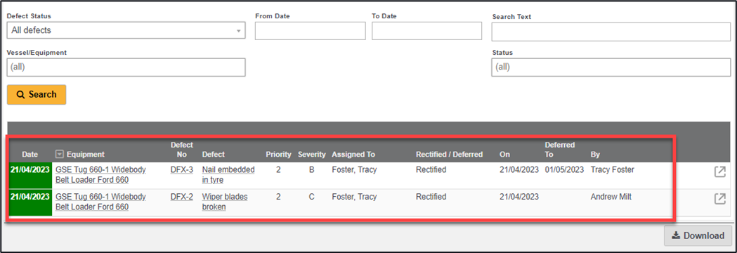 Clicking on the ‘Defects’ button displays the defects summary page, this page is defaulted to show Open and deferred defects only, open defects first but this selection is changeable within the Defect status list, there is also the ability to filter by date, search using text, by Vessell/Equipment, and by Status.
