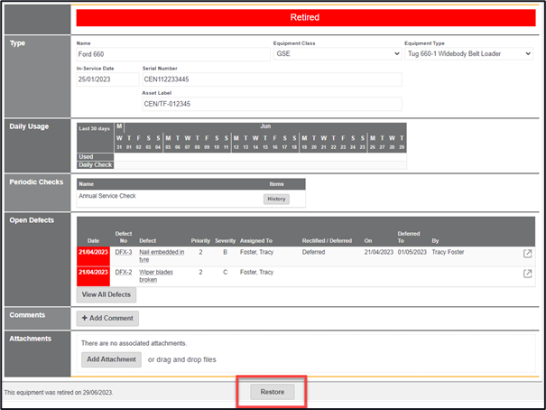 If a piece of equipment is surplus to requirements or if a raised defect means that a piece of equipment must be sent to a specialist for repair then it might be out of your asset list for a few weeks, or months. In this scenario there is a ‘Retire’ button at the bottom of each specific item of equipment, pressing this will remove it from your asset list, once retired this button changes to read ‘Restore’, clicking on this button will restore it to your asset library