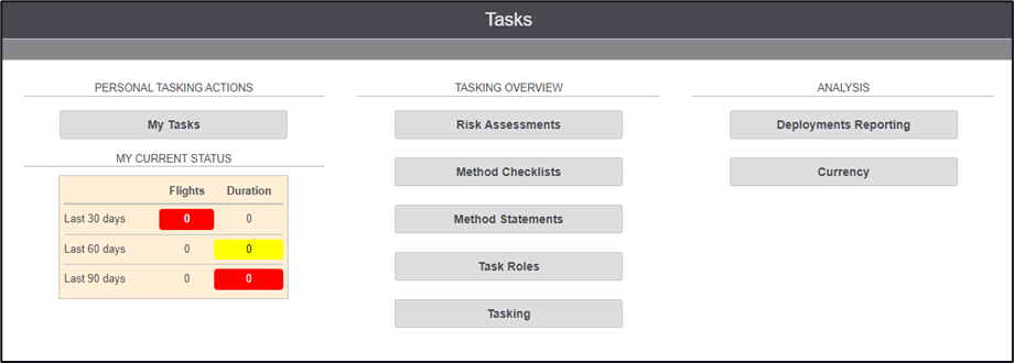 Tasking provides the ability to create tasks for the purpose of UAV operations, underpinning these with associated risk assessments, and equipment checks.