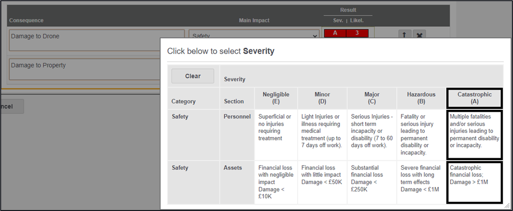 Selecting the Sev area will display the Severity areas and calibration for the risk matrix