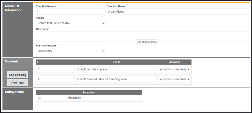 The Method Checklists allows for different checks to be created within Centrik when a trigger has occurred. In relation to UAVs this might be a check before the first flight of the day, a check after, or before each flight, or alternatively after the last flight of the day.