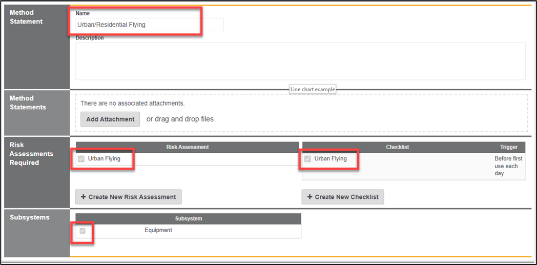 The method statement area allows you to combine created risk assessments and created method checklists into a task, or a type of operational flying.