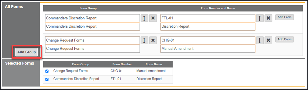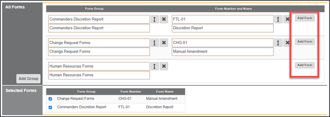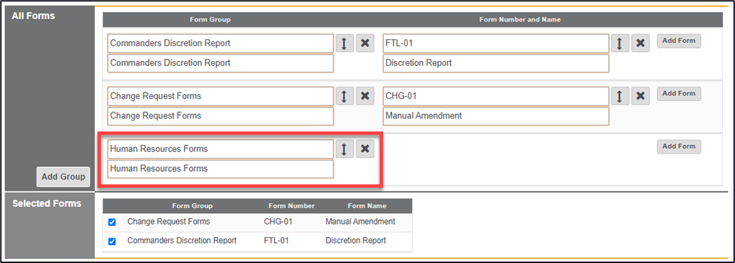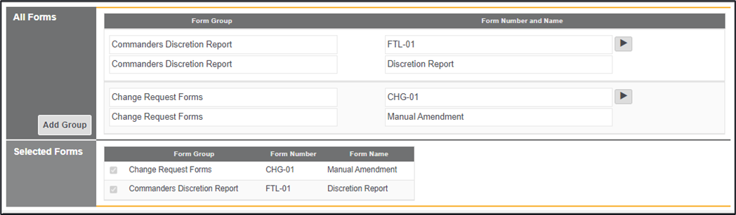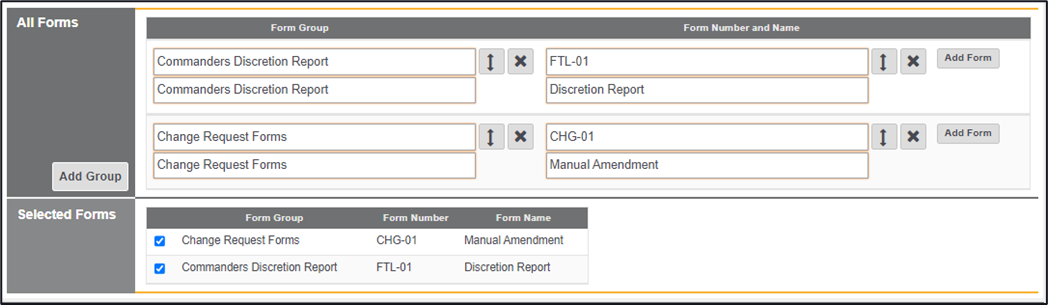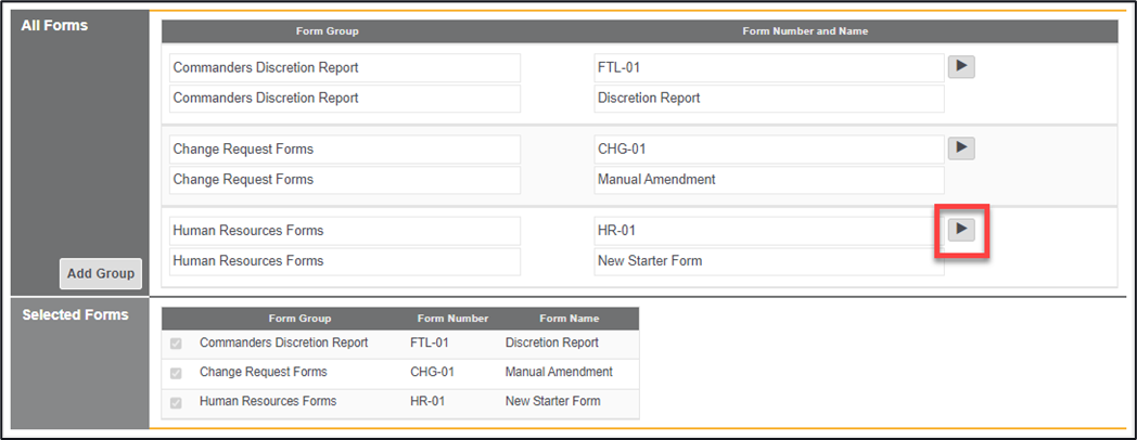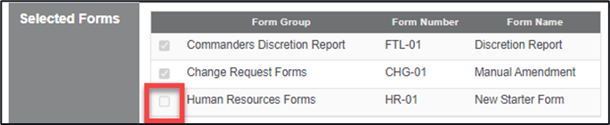 *Note – After adding in the Form Group alongside the Form Number and Name the newly created form will be added to the forms within the Selected Forms area, the form will not be visible though at this stage, unless the check has been ticked