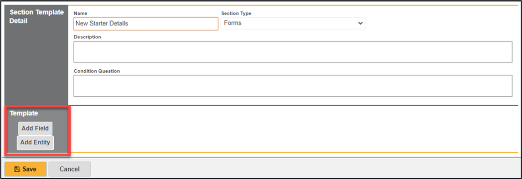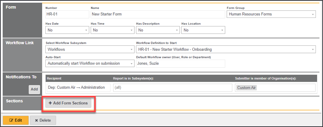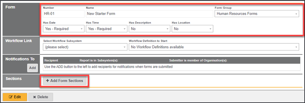 *Note - if this is an existing form then previously selected sections may already be in place, in which case select the ‘Edit’ button to allow sections to be selected)