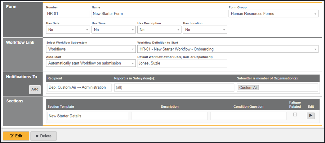 Clicking on the ‘edit’ button allows you to amend the above, when the edit button has been clicked all available sections that currently exist within the forms sections will be displayed, if you want to select one of these for this form click on the checkbox. If a section does not exist, you can create one and select it at a later stage.