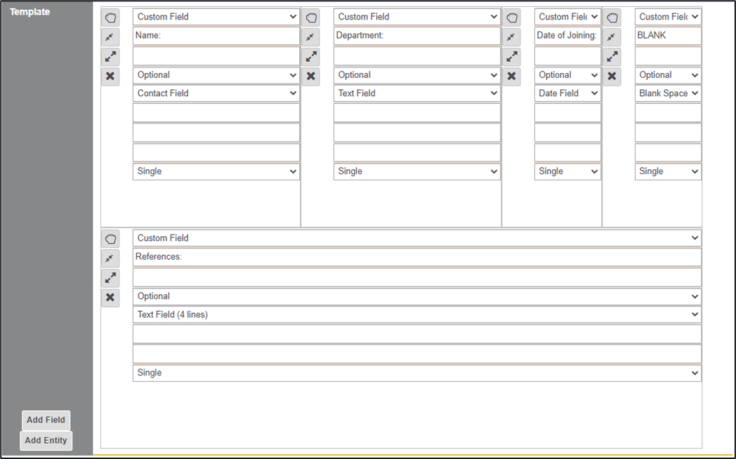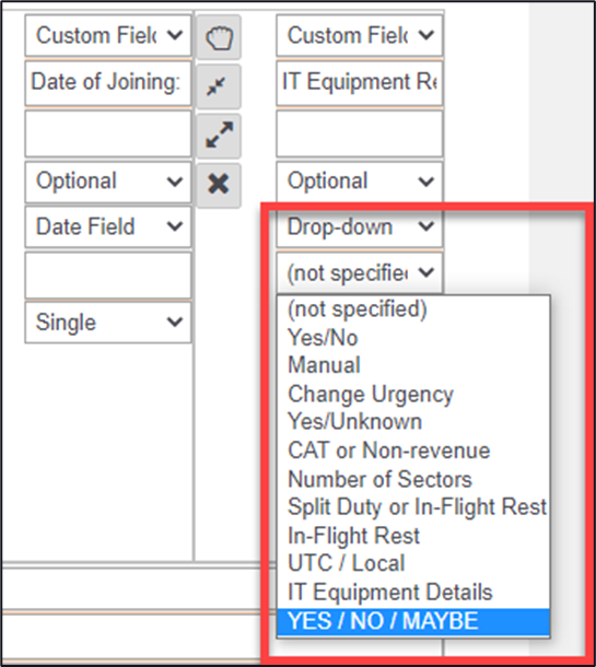 1. A selectable dropdown area of ADREP fields or a custom field, options include a single text box, multi text box, and date amongst others