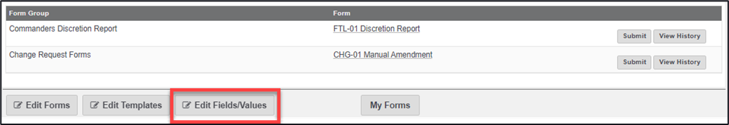 1. From the Forms landing page, click on the ‘Edit Fields/Values’ button.