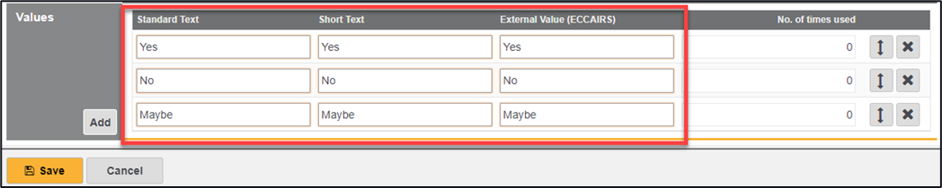 All currently available values lists will be displayed, to edit an existing value click on the ‘Play’ button and add, amend, or delete where required. Clicking on the ‘Save’ button will save your inputted details. To edit a name of a value list, click on the ‘Edit’ button, make the required changes, click on the ‘Save’ button.