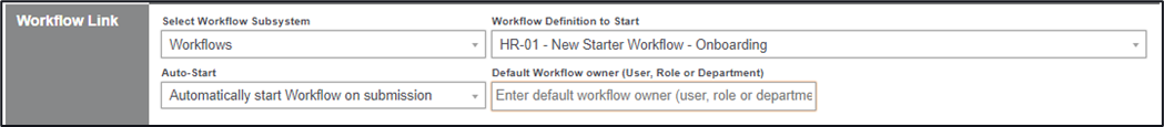 4. Within the Workflow Link section, select the subsystem of where the workflow is, select from the workflows listed, and finally select if you want this workflow to start automatically upon submission of this form, or manually.