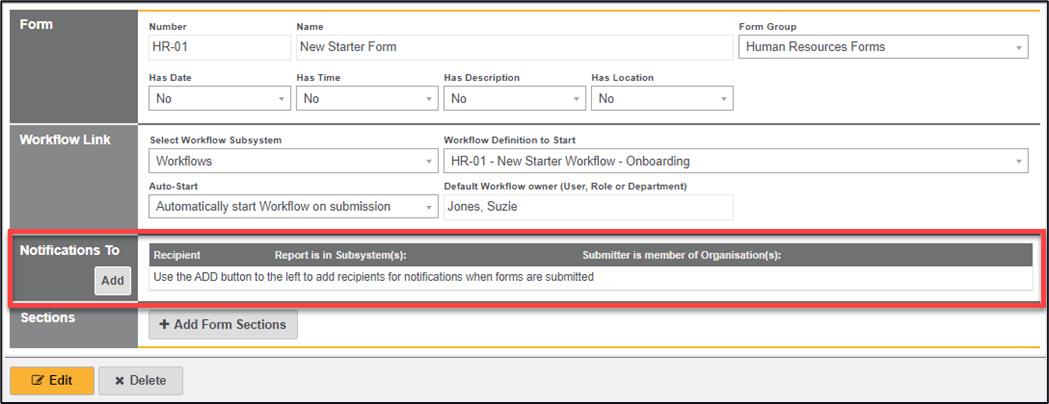Using the ‘Add’ button you can allow for notifications to be sent to a individual, Role, or Department when this form has been submitted