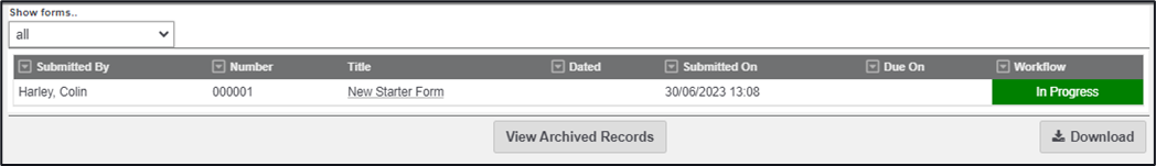A selectable date period can be accessed from the Show forms… dropdown list allowing you to filter forms from the last 3 months, last 6 months, or all.