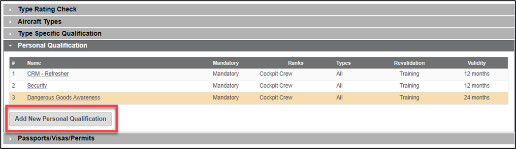 4. Click on the ‘Add New Personal Qualification’ button (the button will take its naming convention from the area that it sits in, for this example it is within the Personal Qualification area)
