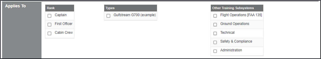 If an individual, or all checkboxes are selected it will only apply to that Rank, Role, or Type. If any additional Ranks, Roles, or Types are added after this qualification has been created and you want these new Ranks, Roles, or Types to be linked to this training, the qualification will need to be updated, or edited to include these additions.