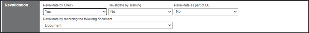 10. Select the Revalidation method for this qualification, if a Check is selected as YES, an additional area (Individual Course Revalidation Method), and an area for a Checklist is created. A revalidation method of recording a document type can be selected allowing an individual to upload their own training (if configured)