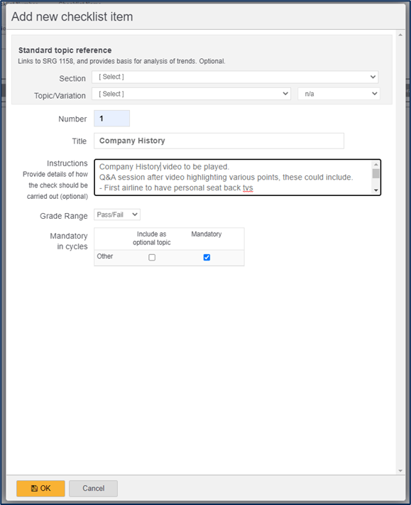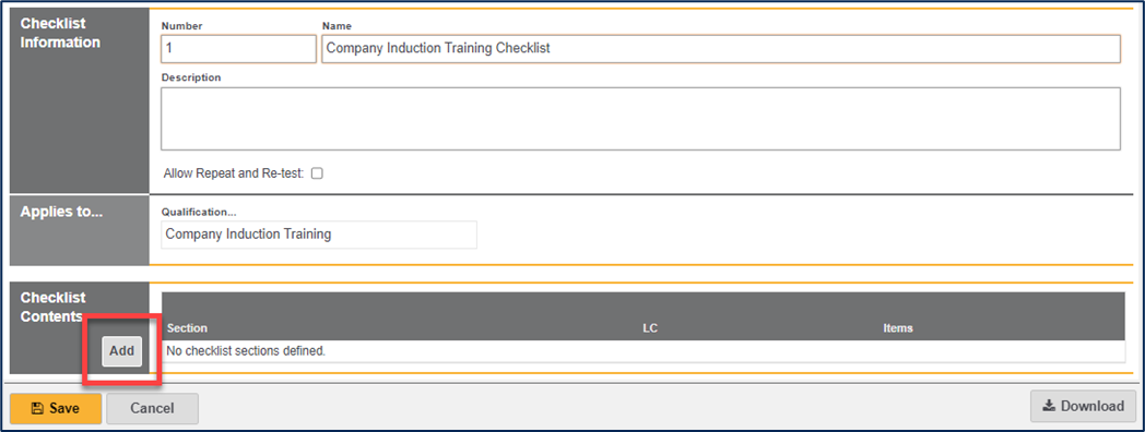 The Number and Name of this checklist is prepopulated, this can be amended if required within the available areas, there is an optional description box, and the ability to Allow Repeat and Retest checkbox. The qualification that this Applies to.. is also shown.