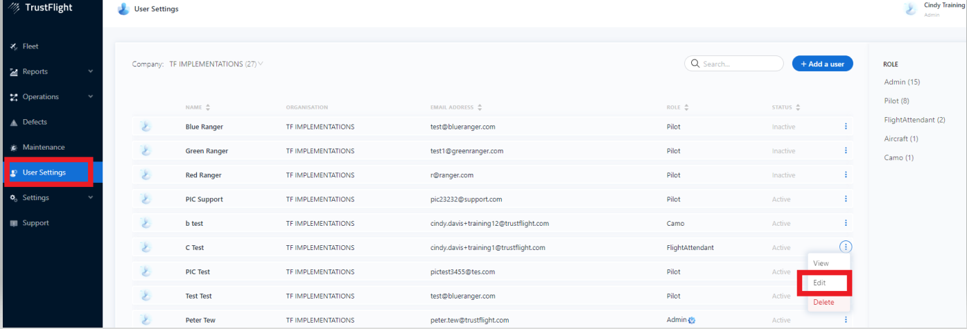 5. On User settings, select the aircraft, on the 3 dots, click on view and click Send Password Reset Link