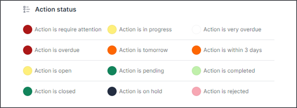 Overdue Actions - Actions showing as Overdue have a due date that has passed. These appear as Red within Dashboards. Overdue Actions can still be Completed by the Action Owner or the Delegated user. They can also be Closed by the Action Creator or Rejected by the Owner/Delegated User.
