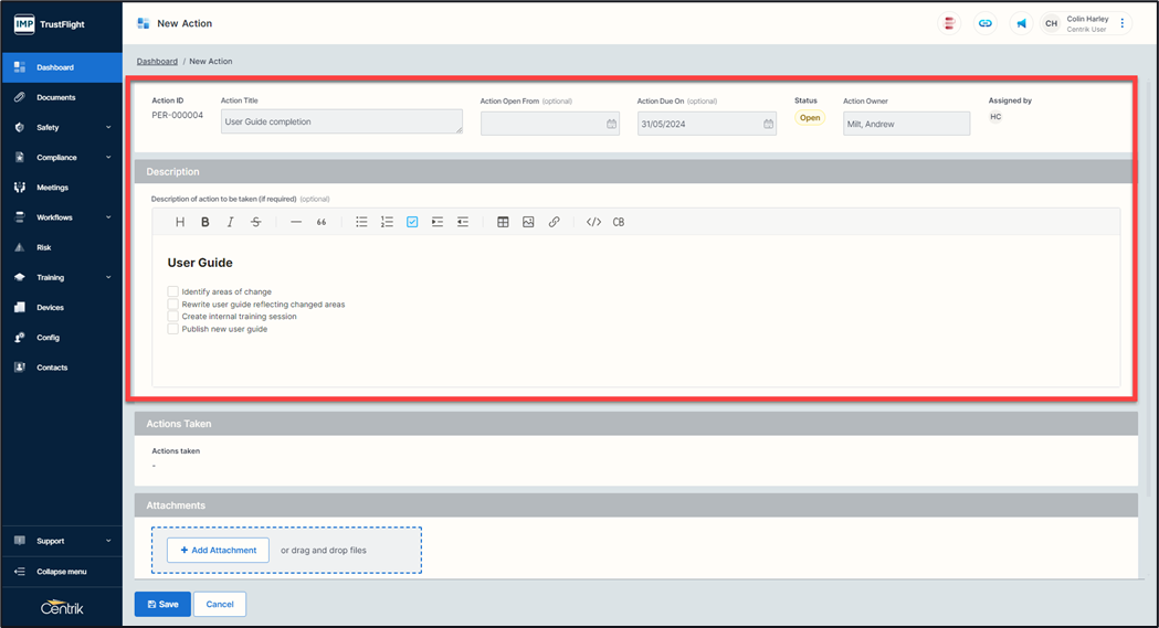 Actions can exist across the suite of Centrik modules. If an Action is created within the personal dashboard area on the home page, then this is known as a Personal Action and not related to a specific Module.