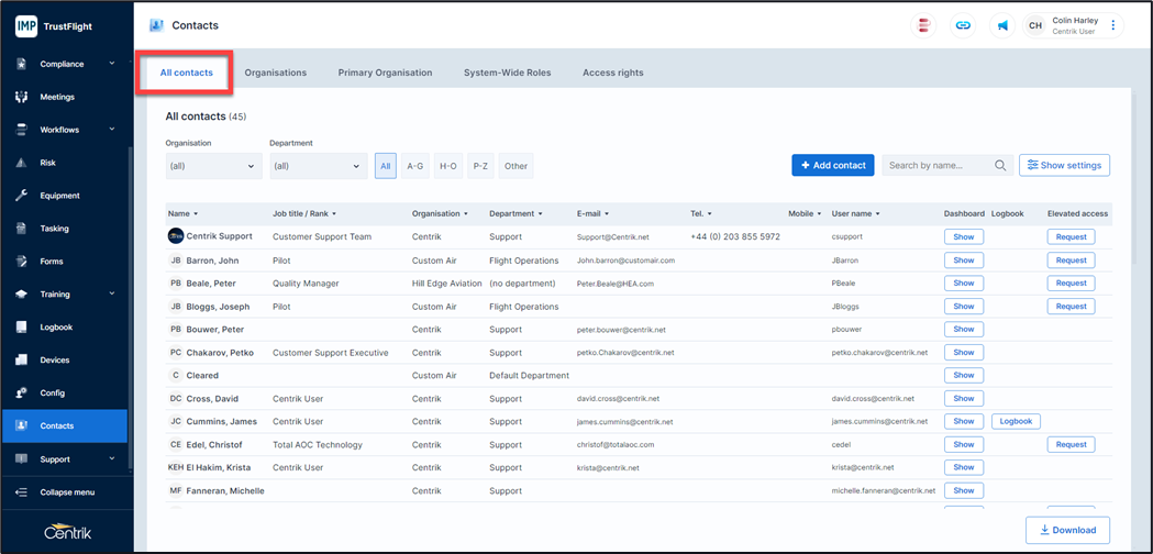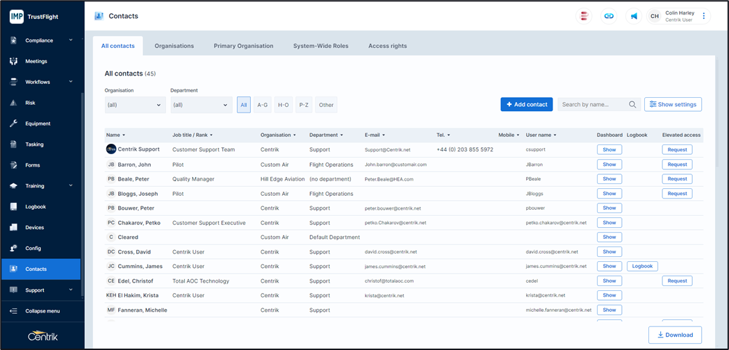 The Contact’s module is the area of Centrik where users are added to the system. In its simplest form it can be used as a directory to house all your organisational contact details such as individual names, telephone numbers, email addresses and next-of-kin details (if enabled)