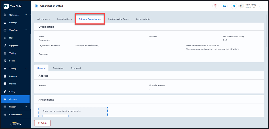 Primary Organisation Tab