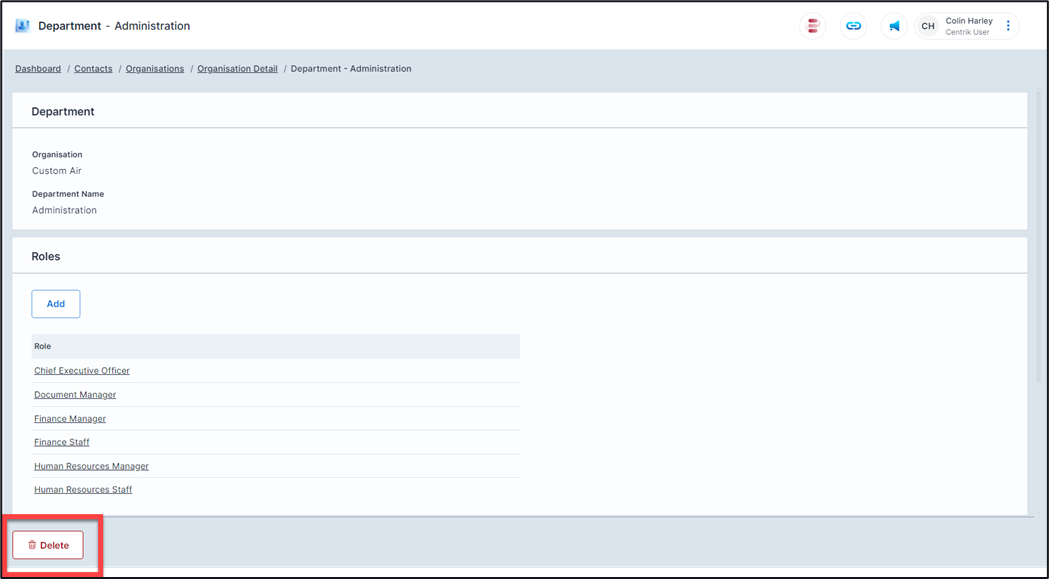 Selecting the ‘Delete’ button on this page will delete that entire department.
