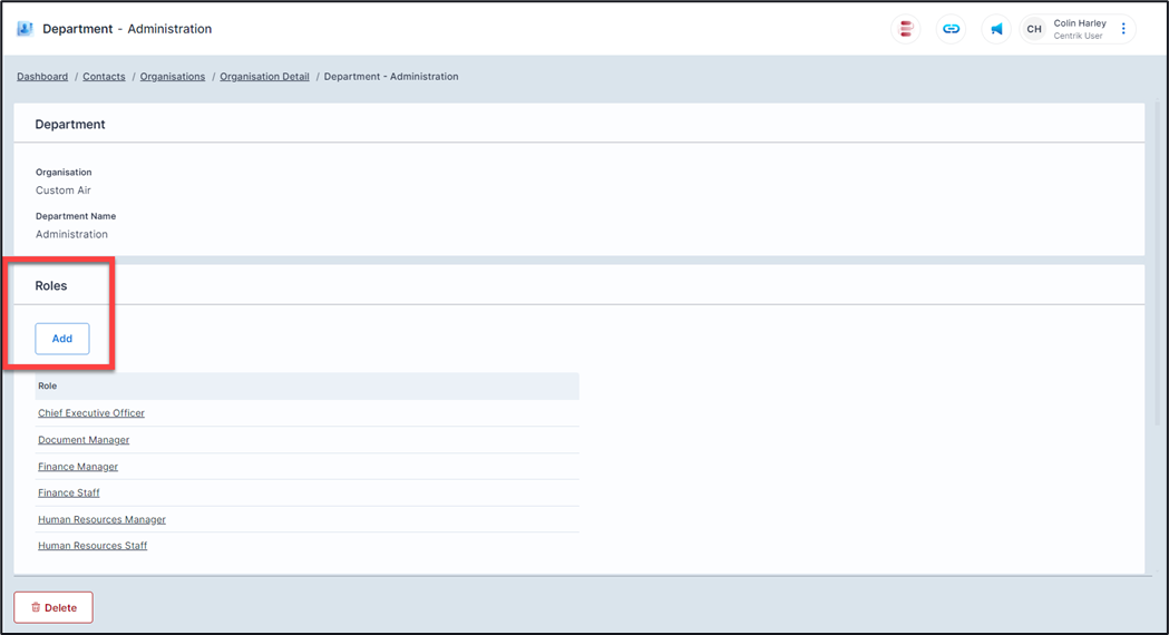 To change the name of a role you can click on the Name field of the Role, make the required changes then click on the ‘Save’ button. To delete a role, click on the ‘Delete’ button.