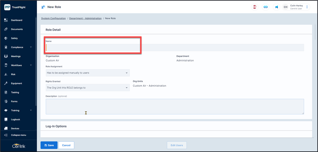 3. Add in the name of the newly created role (a required field), you can choose the role assignment (default is assigned manually to users) and the rights granted (default is ‘the Org Unit this ROLE belongs to’) alongside a description (not required).