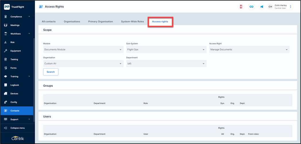As each Role, and individual contact can have its own access rights, its important that you know who has what access right allocated to them and why. The Access Rights area allows you to view who in your organisation has what access right.
