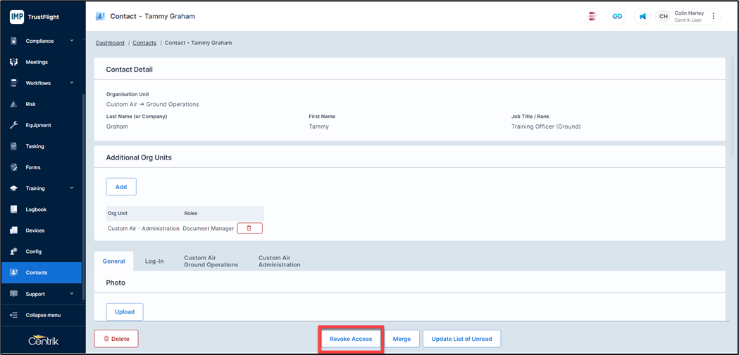 2. Once in their individual record click on the ‘Revoke Access’ button.