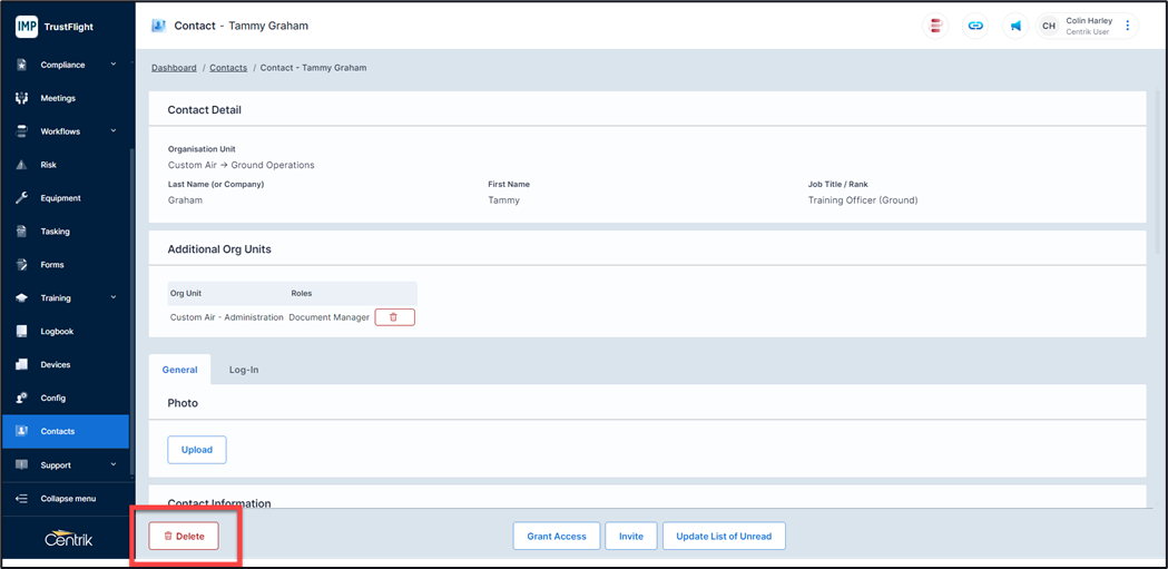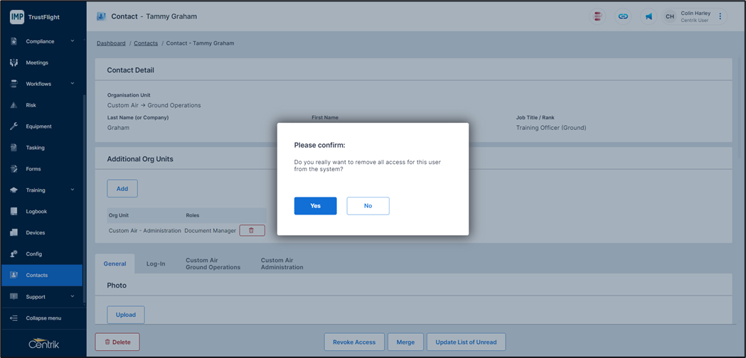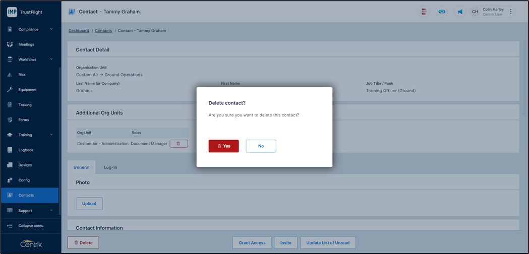 The user’s access to Centrik has been removed, they will remain on the contacts list for your organisation but cannot access Centrik.