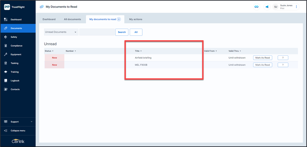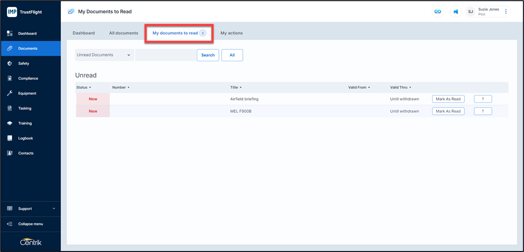 The document must be opened before it can be marked as read, attempting to click the ‘Mark as Read’ button from the overview page will generate a system warning.