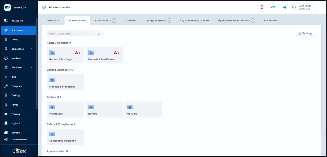 The Document Module is not just a repository for documents but can be used to control who has access to each document or type of document, and track who has read such documents. For example, a large airline has manuals which the pilot needs to read and have access to, an engineer does not necessarily need to read the manual but may need to have access to it.