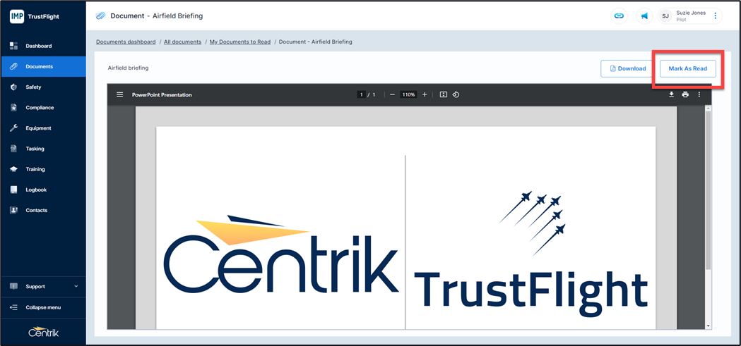 The ‘Mark as Read’ button displays if document tracking is enabled by your organisation.