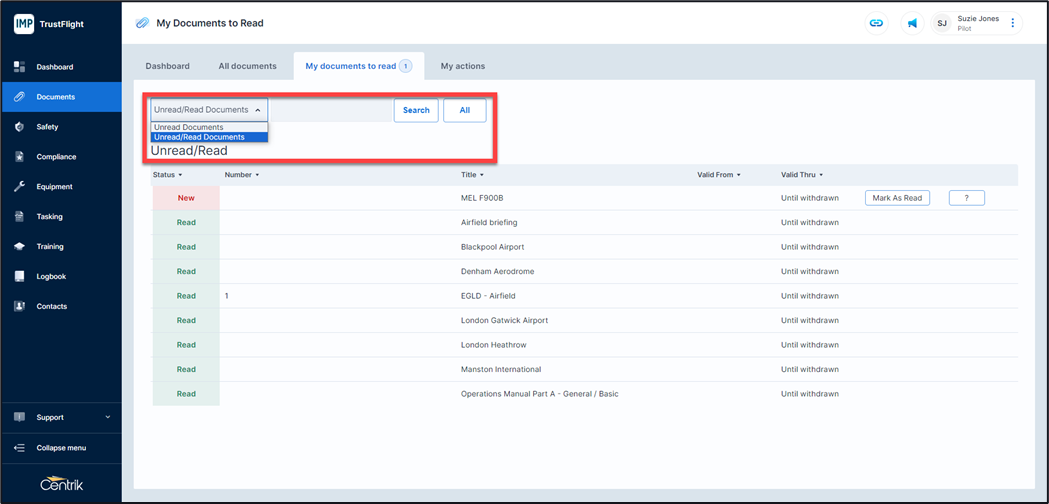 Changing the filter within the search area will allow you to view Unread Documents or a combined listing of Unread/Read Documents.