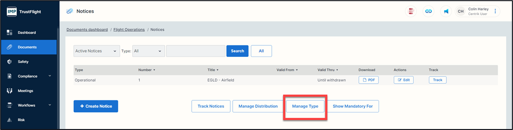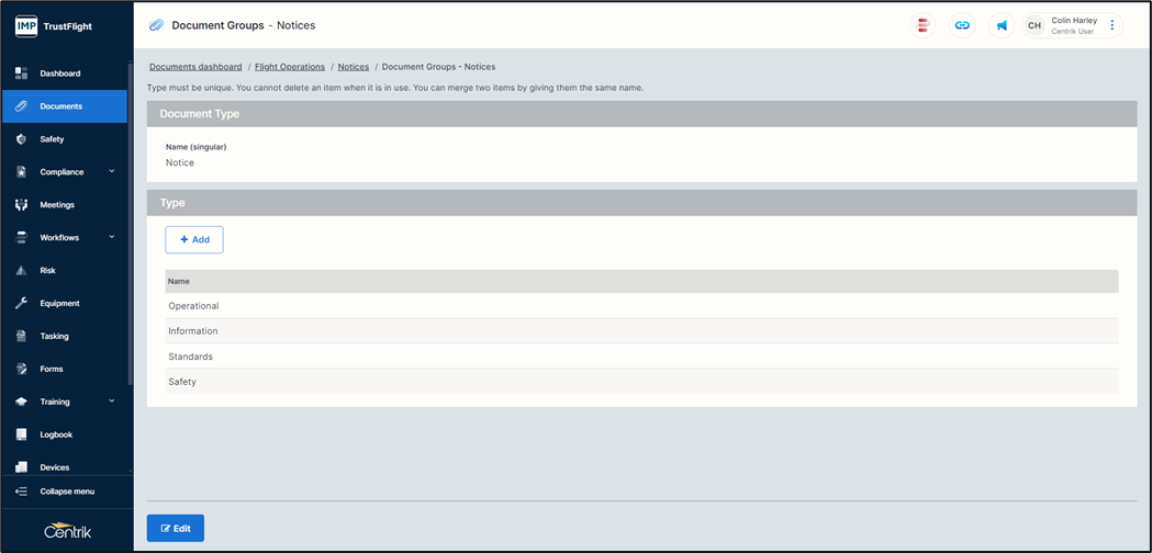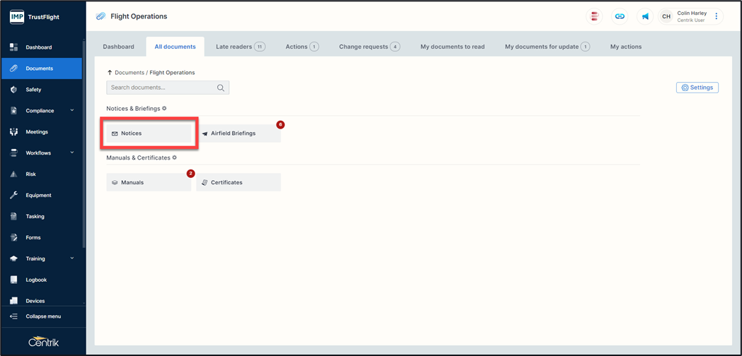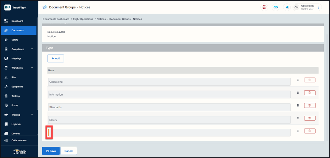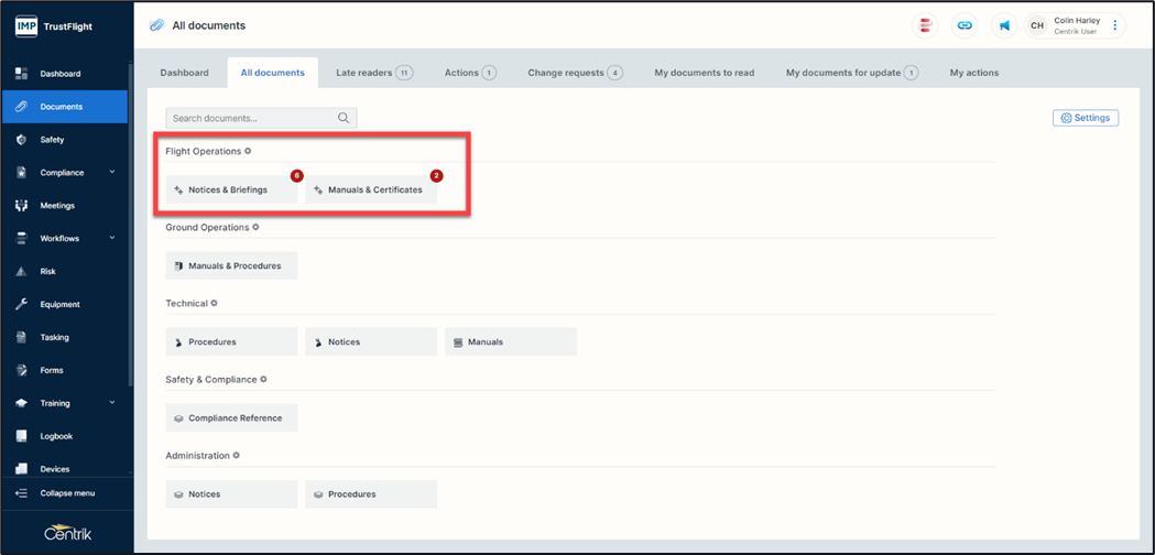 When you add a document to the system this will allow you to categorise it under a specific heading, for example Flight Operations, Security, Ground Operations etc.