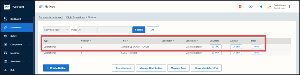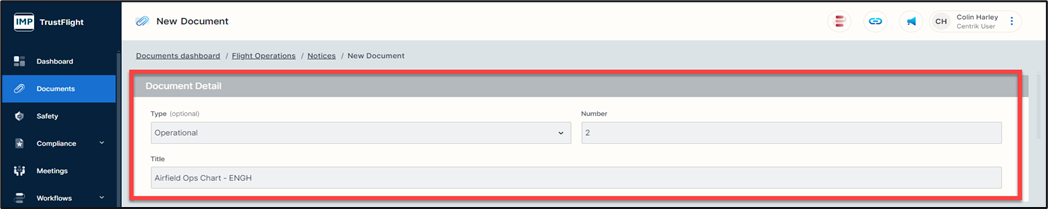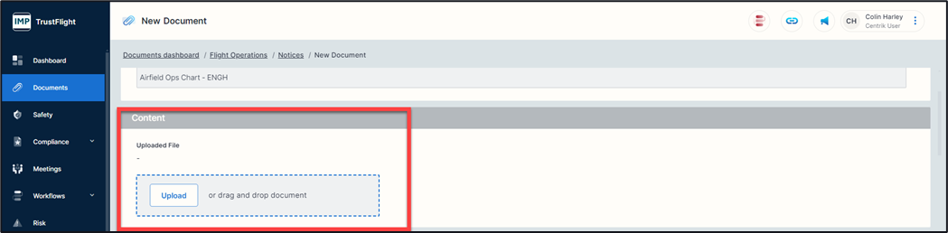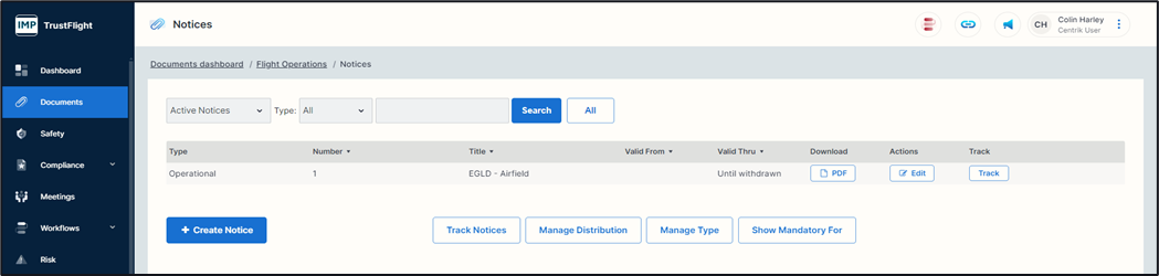 Within each document folder there is a ‘+’ button followed by a naming title of that folder (example is ‘+ Create Notice). It is here that you can add a new document if you have the necessary access rights to do so.