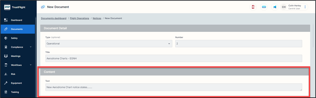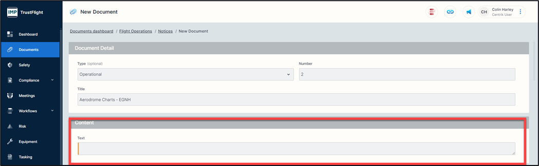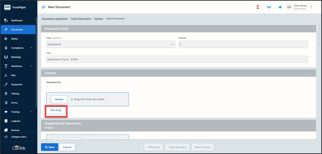 Whichever format you select (Text Only, File Upload, or URL) your document might have some other areas that need completing depending on system configuration. In basic terms your document requires a title, some content (the actual document) and a date that it was created on. The system will automatically capture the name of the individual creating this document alongside the date and the time.