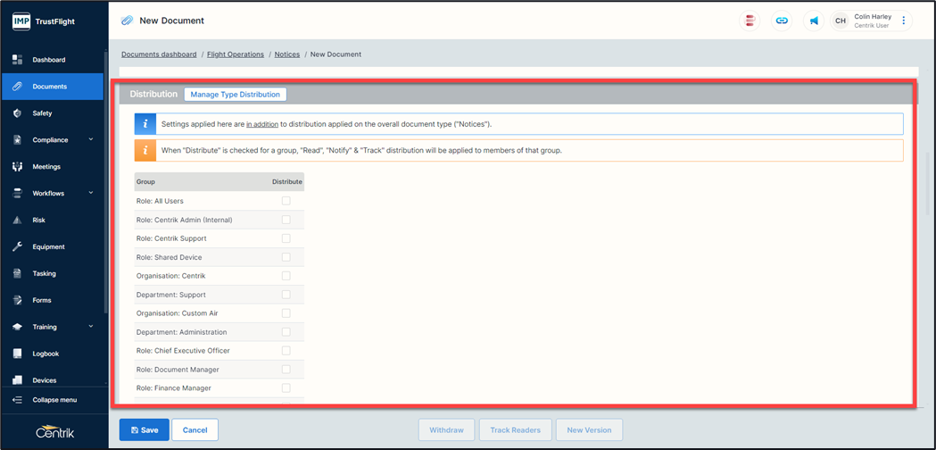 3. When all the appropriate Roles have been selected you can click on the ‘Save’ button to distribute your document.