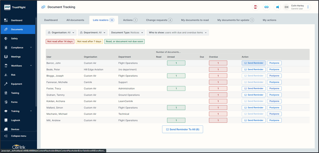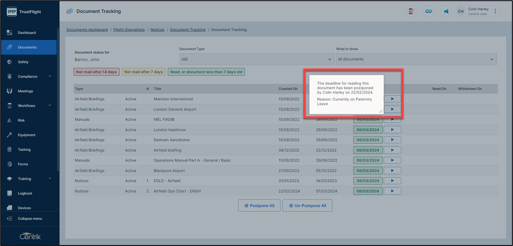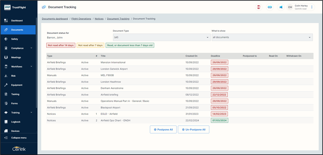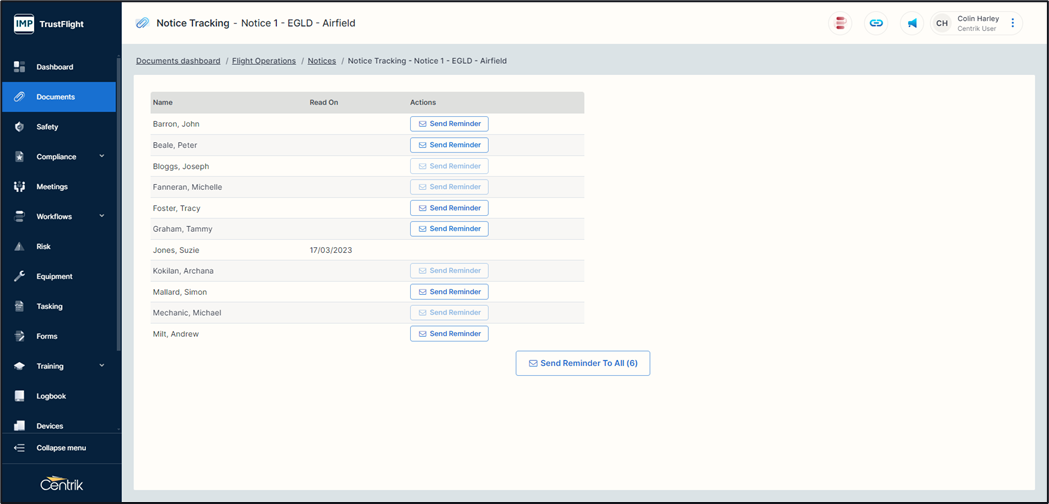 Alongside many core functions within Centrik the ability to track document distribution is valuable to a document owner or document manager. This allows you to track if a document has been read by an individual as well as sending reminders for unread documents.