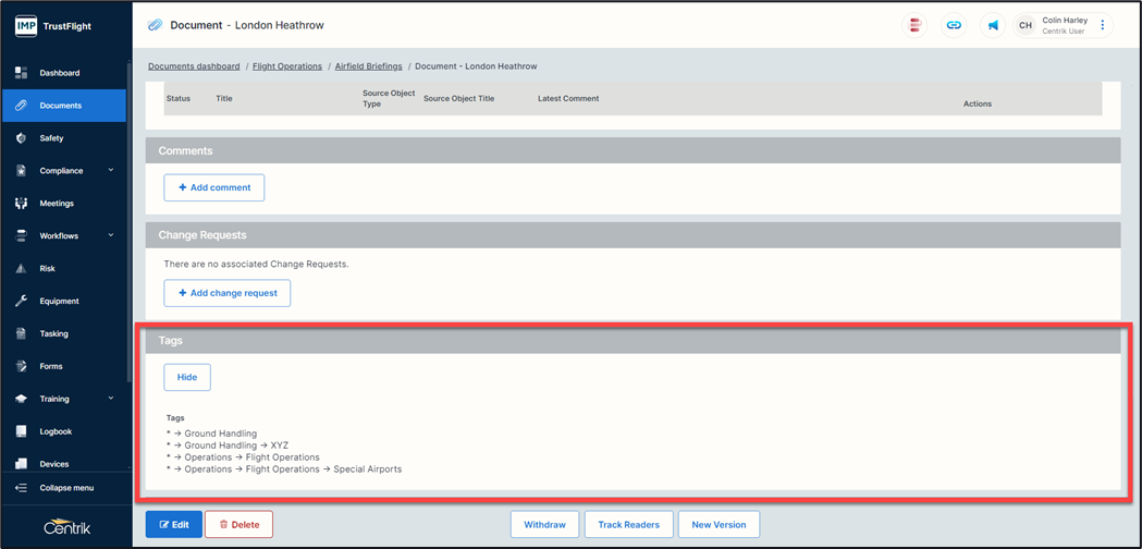Centrik can facilitate the creation of tags within each Centrik site (this is a configuration option). Tagging is used extensively throughout aviation to support policy, processes, legislation, regulation, and procedures.