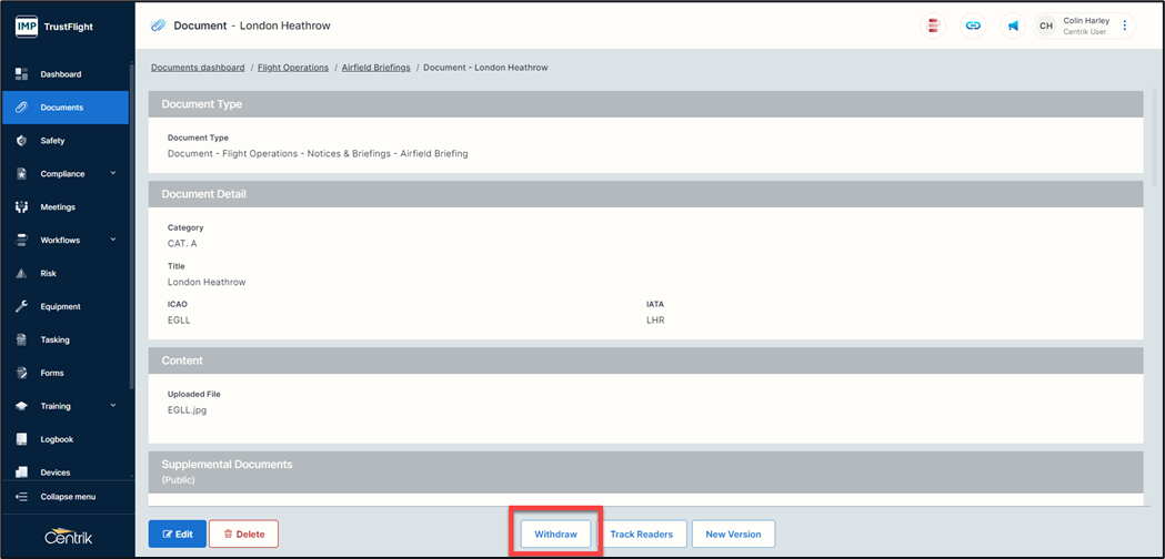 4. Click on the ‘withdraw document’ button.