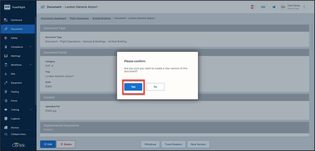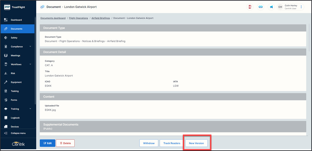 This is achieved by using the ‘New Version’ button at the bottom of the document page (accessed from within a specific document).